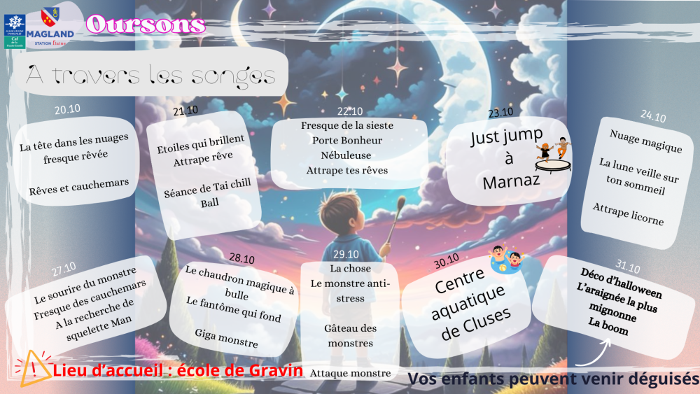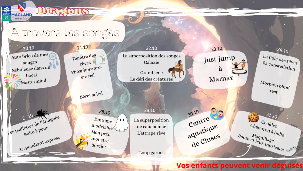 Vous êtes ici : Accueil > Vie pratique > Service Enfance Jeunesse > Accueil de loisirs Accueil de loisirs Publié : 13 juin 2017 Mis à jour : 10 octobre 2025 Pour tous renseignements : Mail : enfancejeunesse@magland.fr Téléphone : 07.76.71.89.33 Fiche renseignements 25/26 Tarifs Centre de Loisirs Règlement extra scolaire