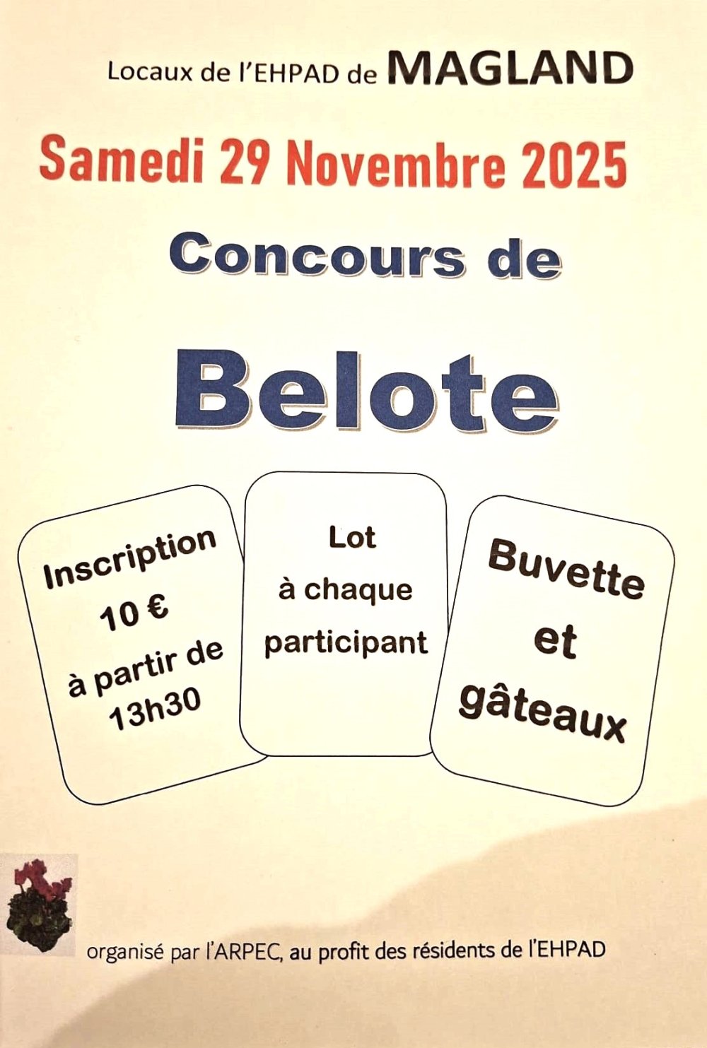 Vous êtes ici : Accueil > Agenda > Concours belote Arpec Concours belote Arpec Publié : 13 novembre 2025
