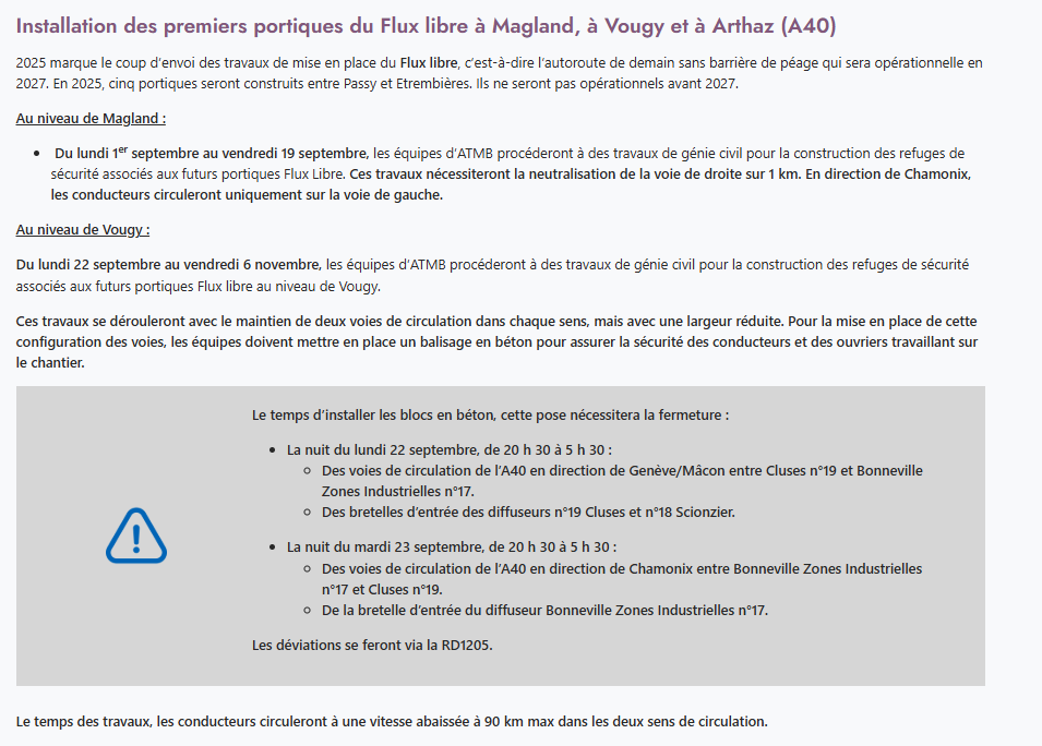 Du lundi 1er septembre au vendredi 19 septembre, les équipes d’ATMB procéderont à l’installation des refuges associés aux futurs portiques Flux libre au niveau de Magland (A40).